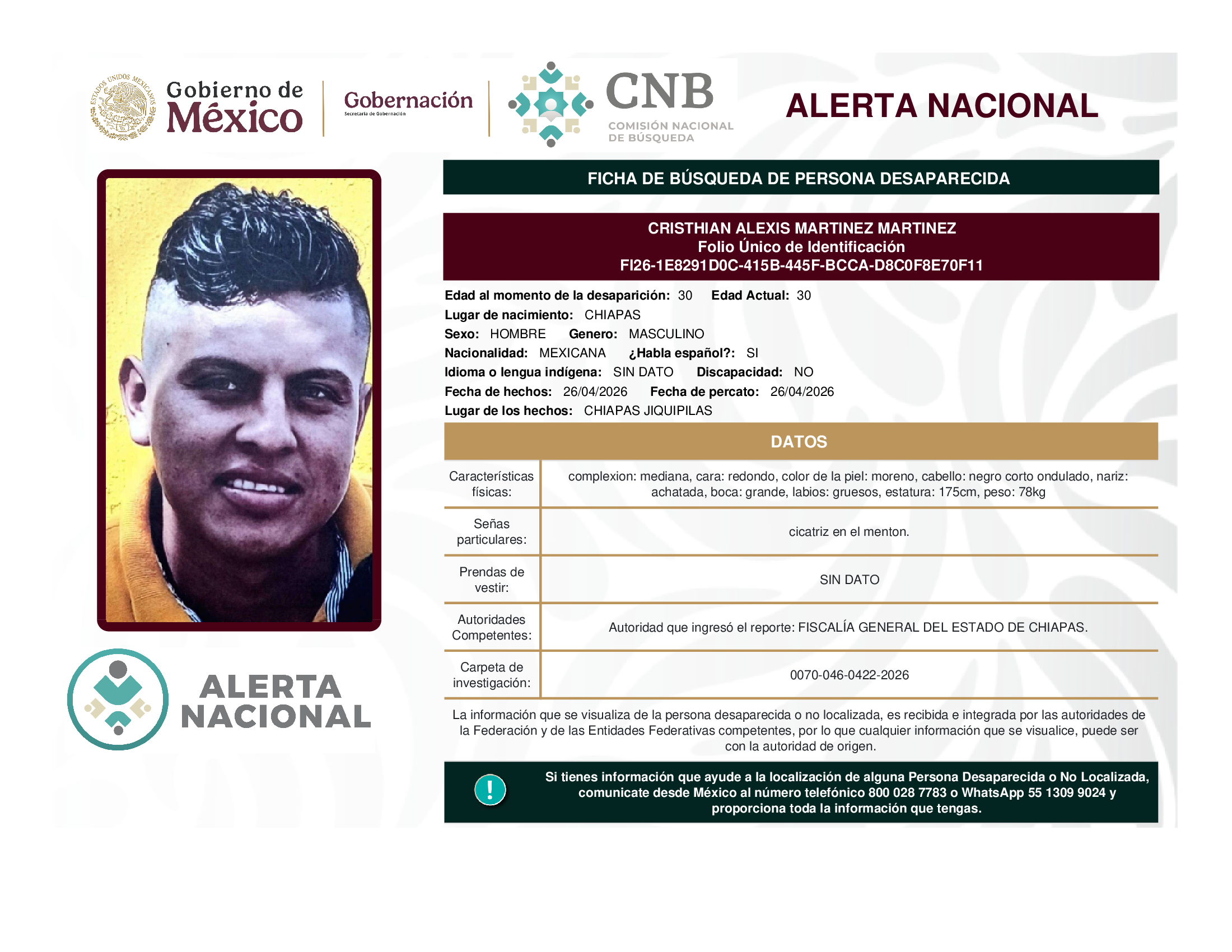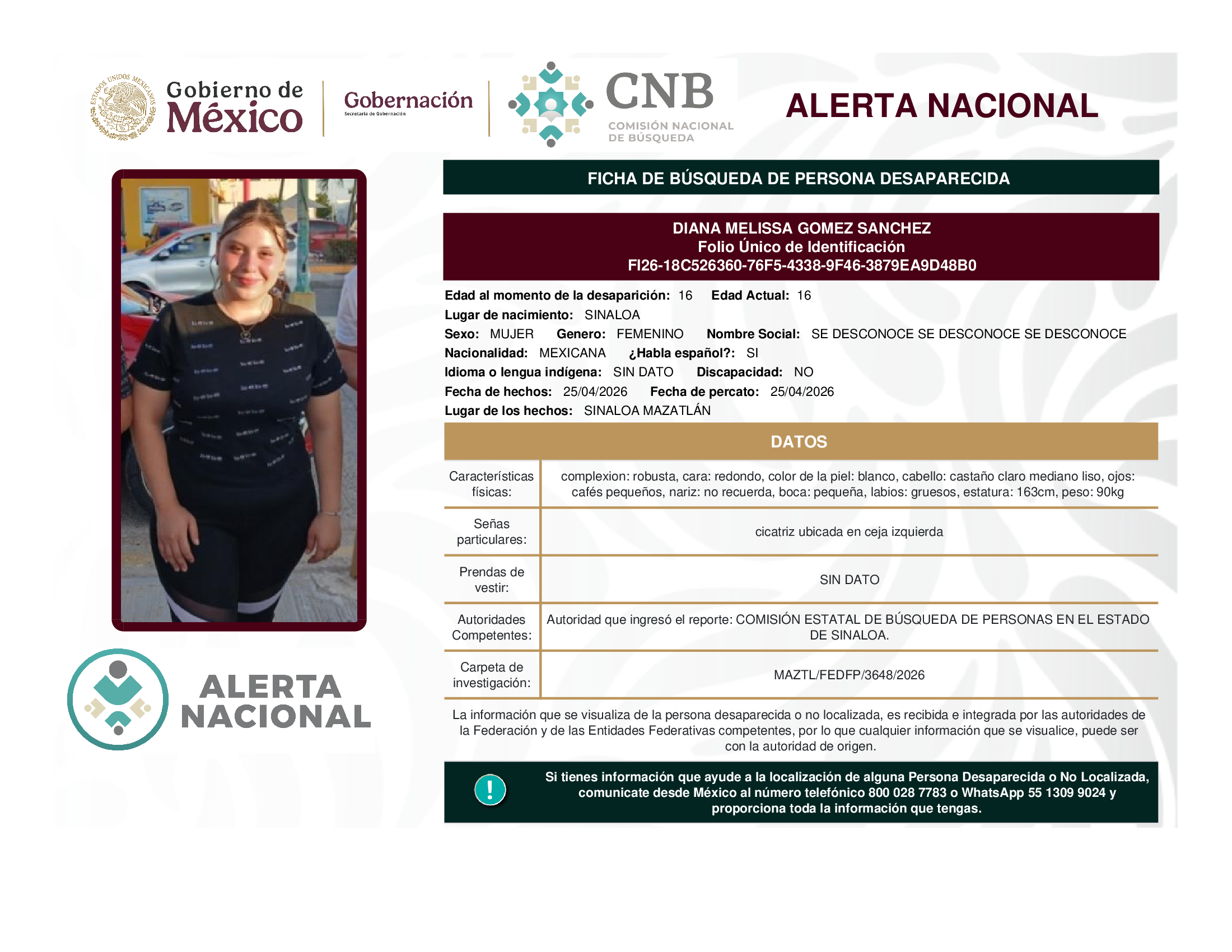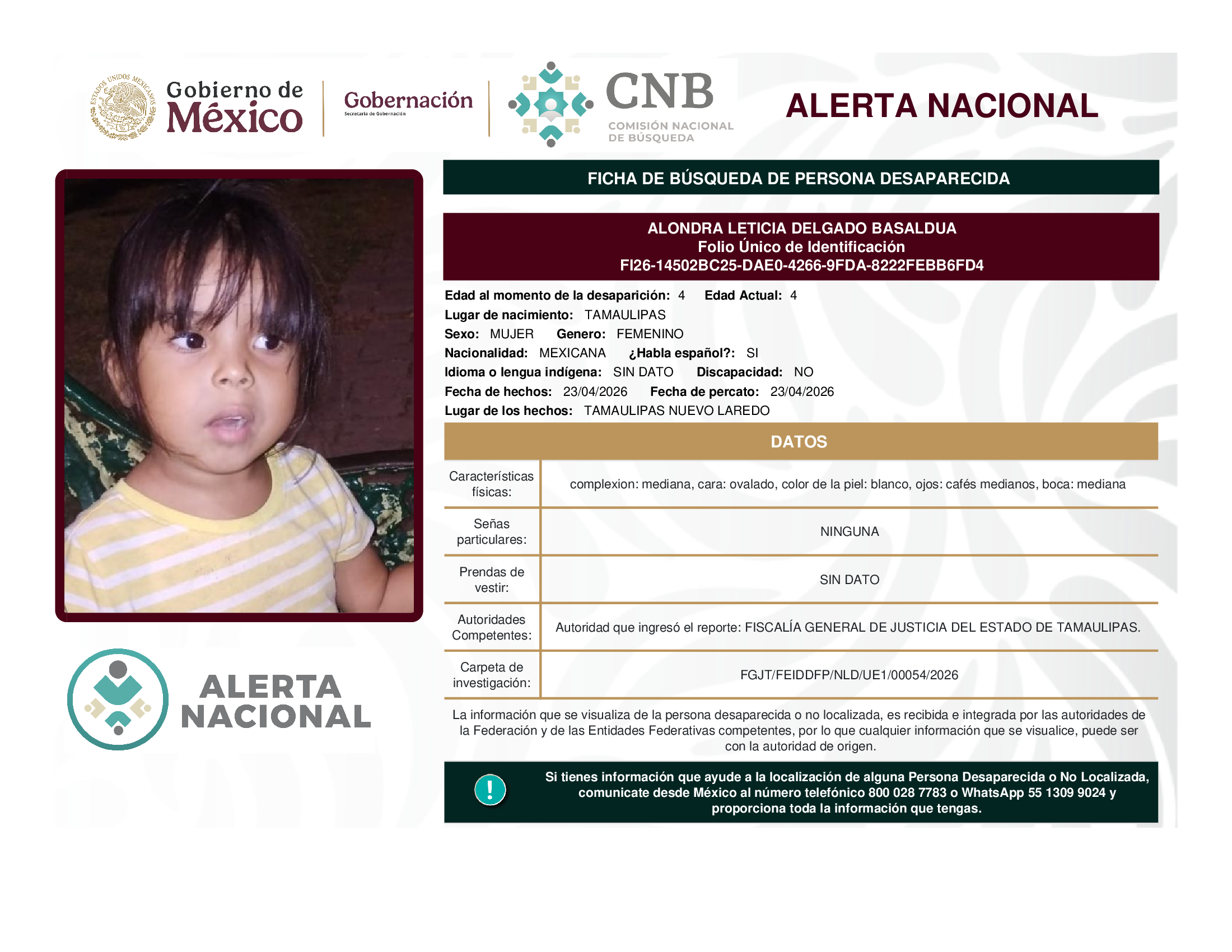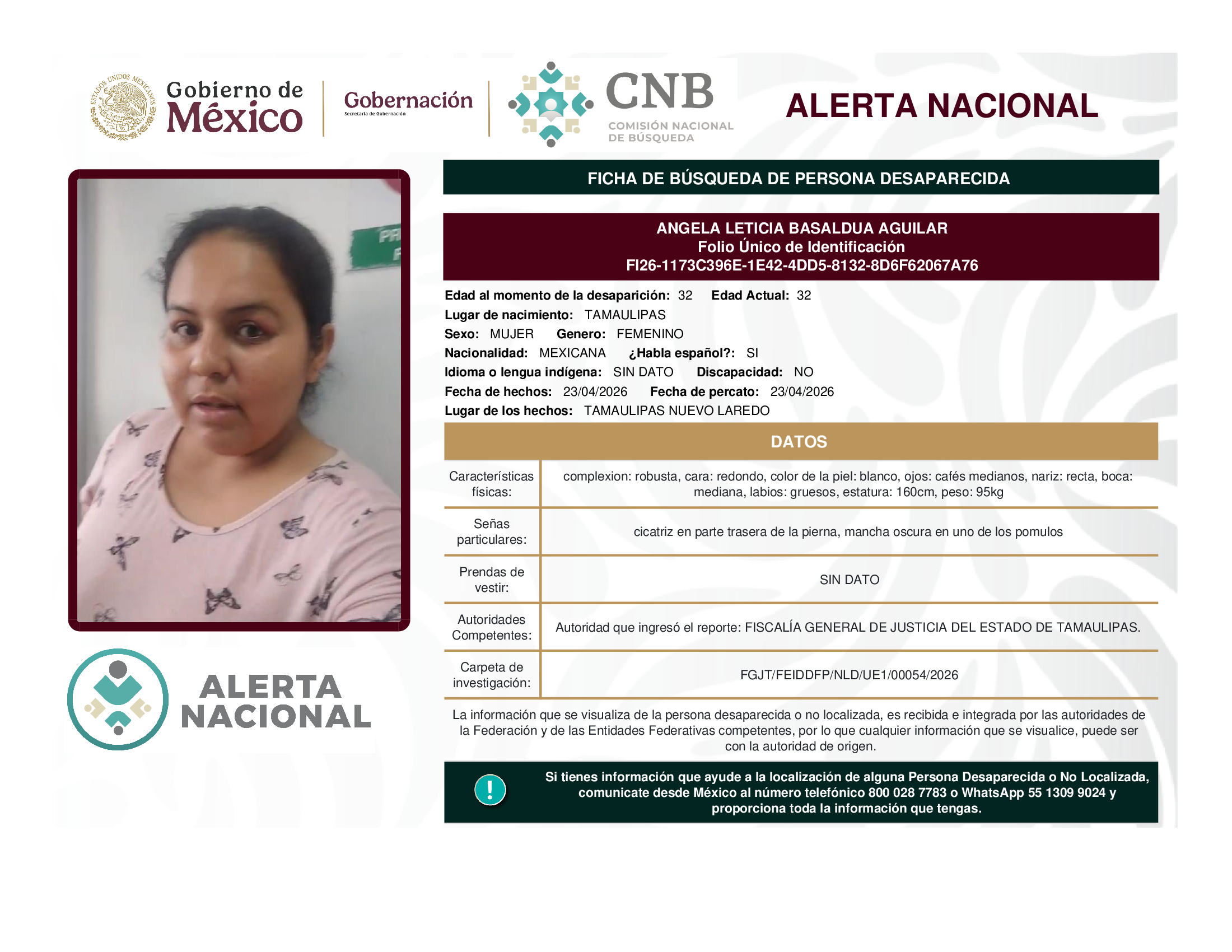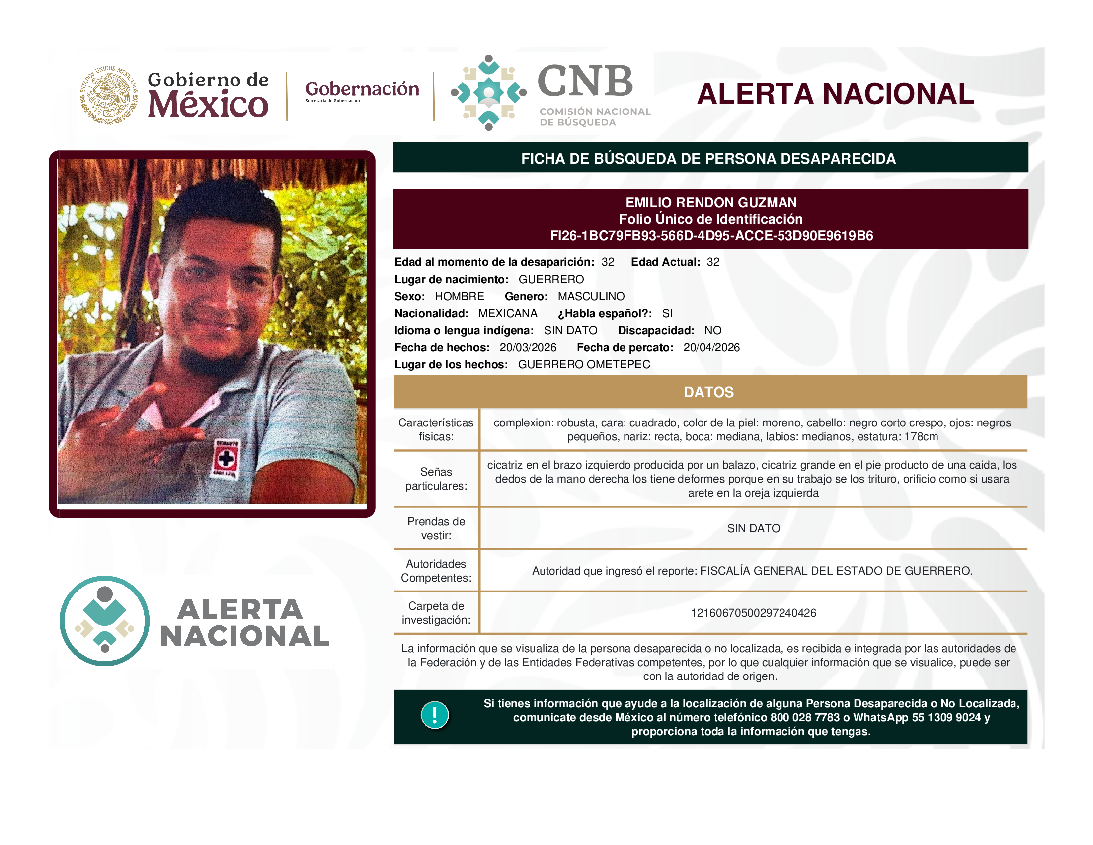 A solicitud de la Comisión Nacional de búsqueda de personas y con fundamento en la Ley General en Materia de Desaparición Forzada de Personas, Desaparición Cometida por Particulares y del Sistema Nacional de Búsqueda de Personas, así como el Protocolo Nacional para la Activación de la Alerta Nacional de Búsqueda, Localización e Identificación de Personas Desaparecidas y No Localizadas, publicado en el Diario Oficial de la Federación el 18 de febrero de 2026, se hace de su conocimiento las siguientes Fichas de Búsqueda de Personas Desaparecidas y No Localizadas: