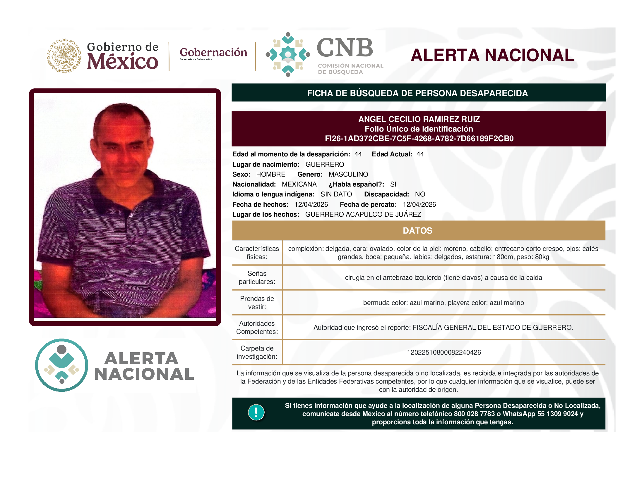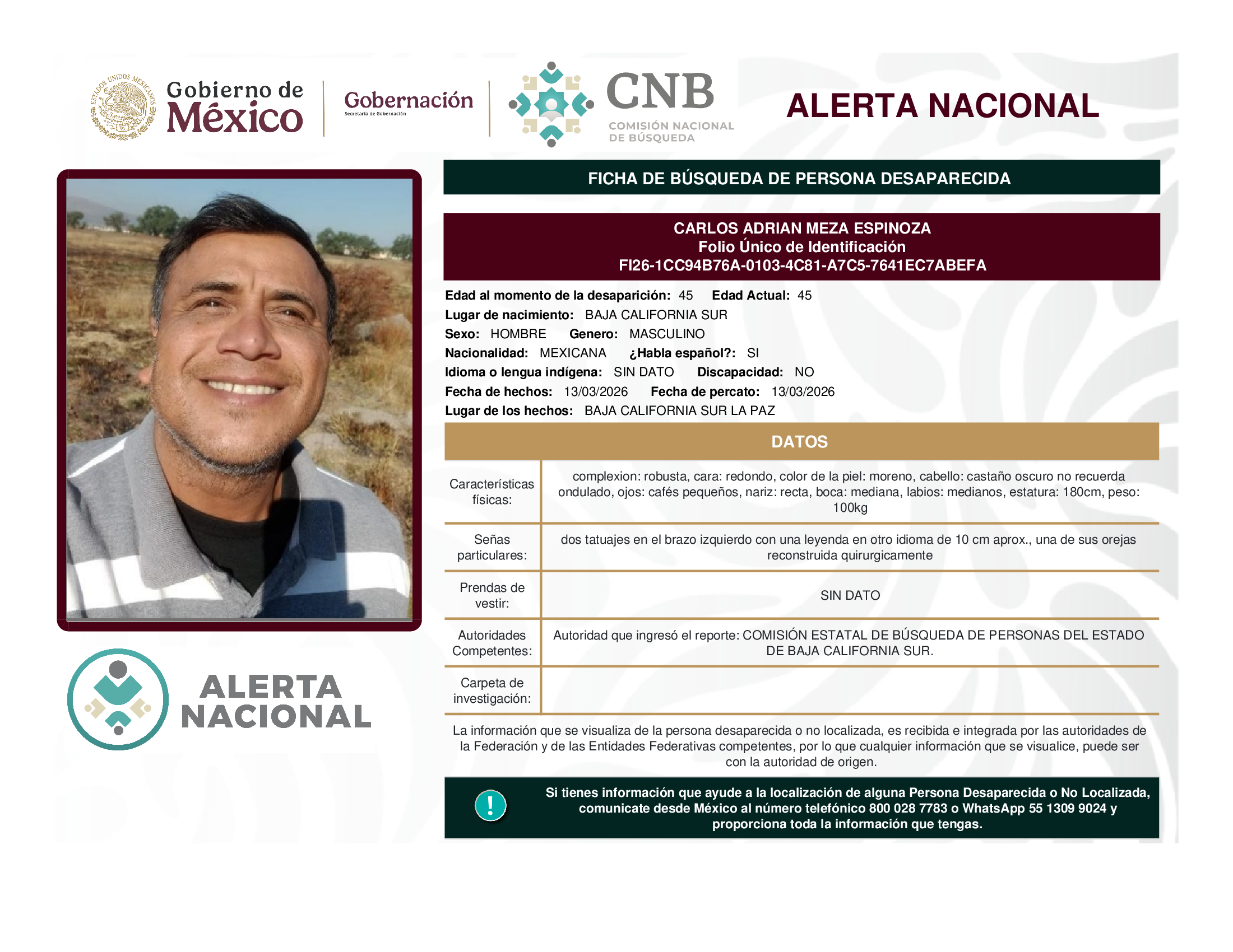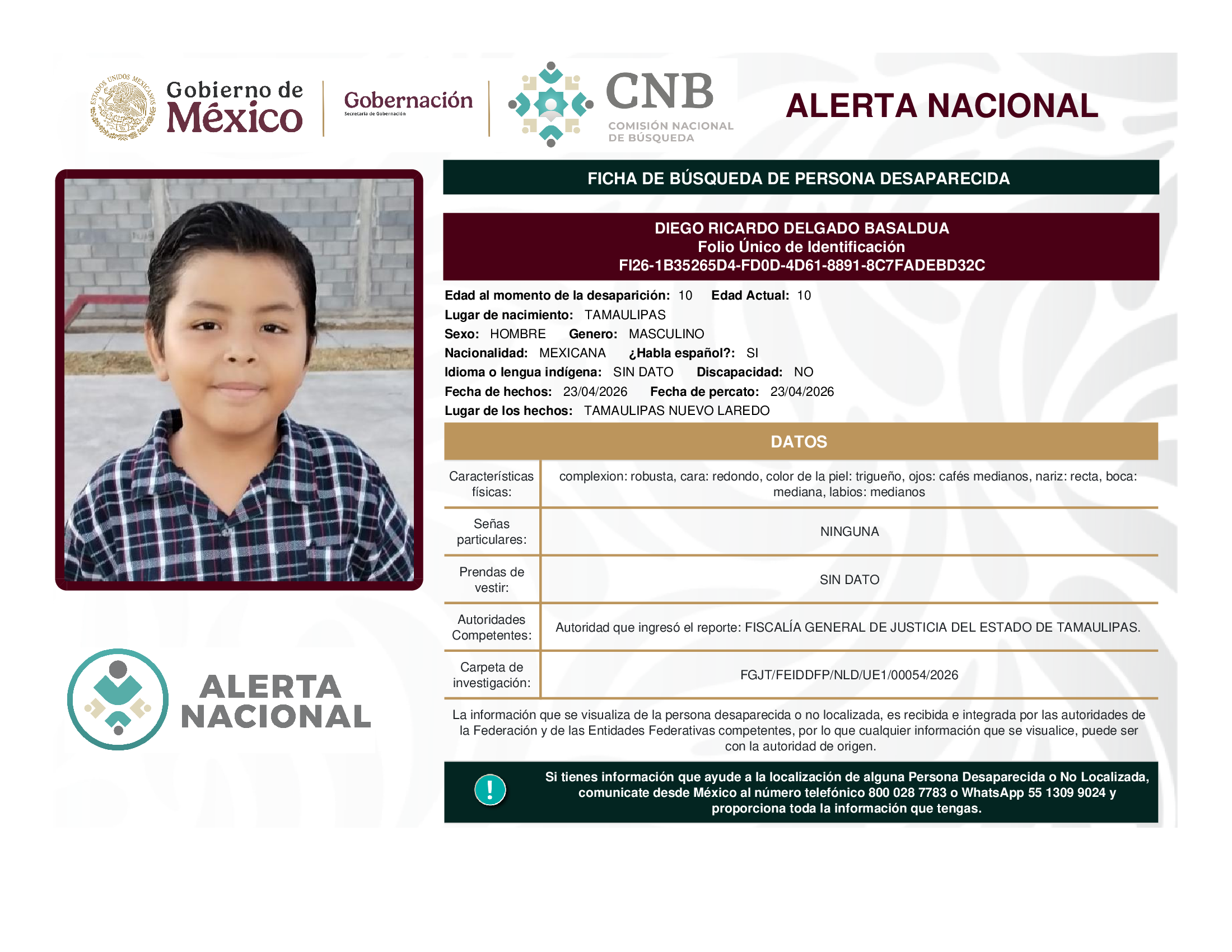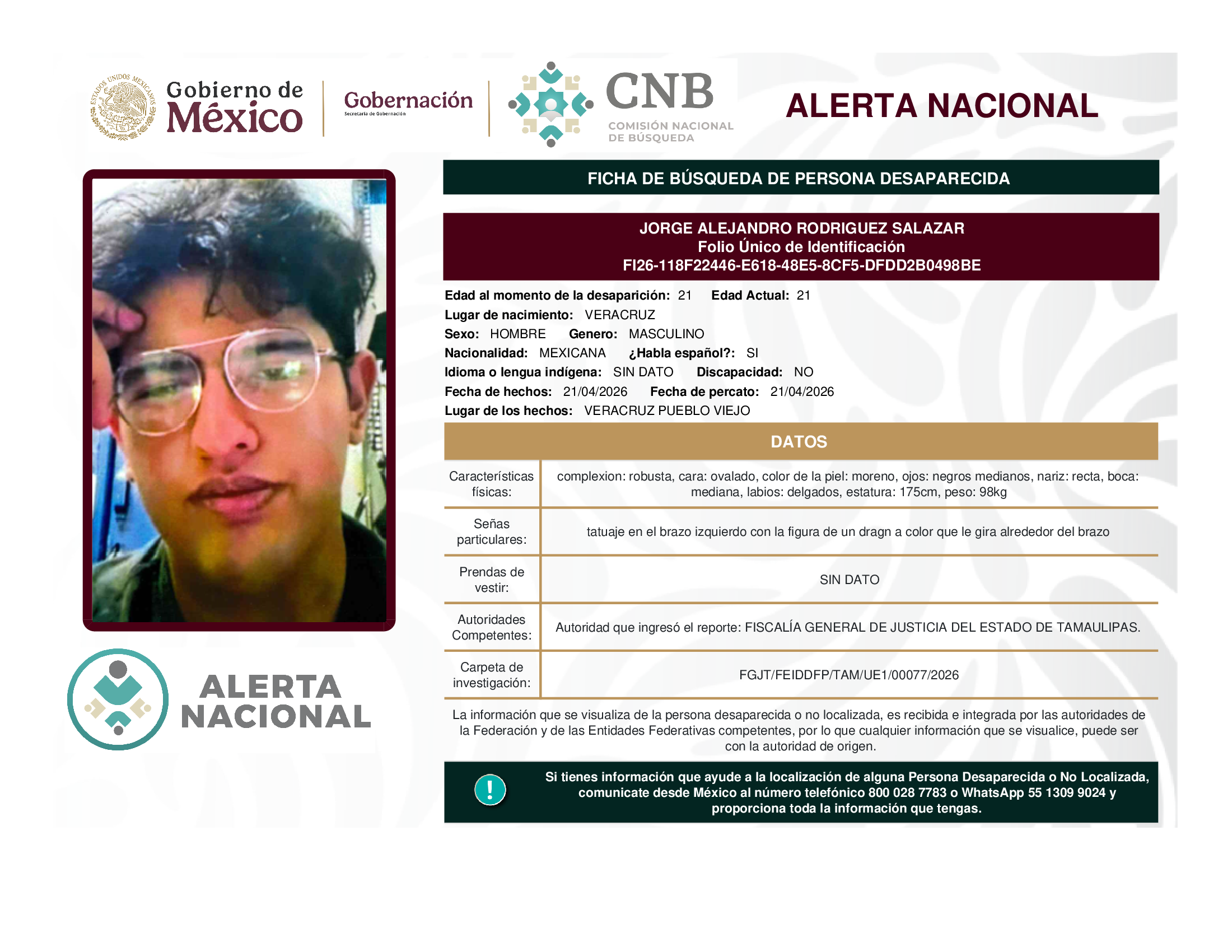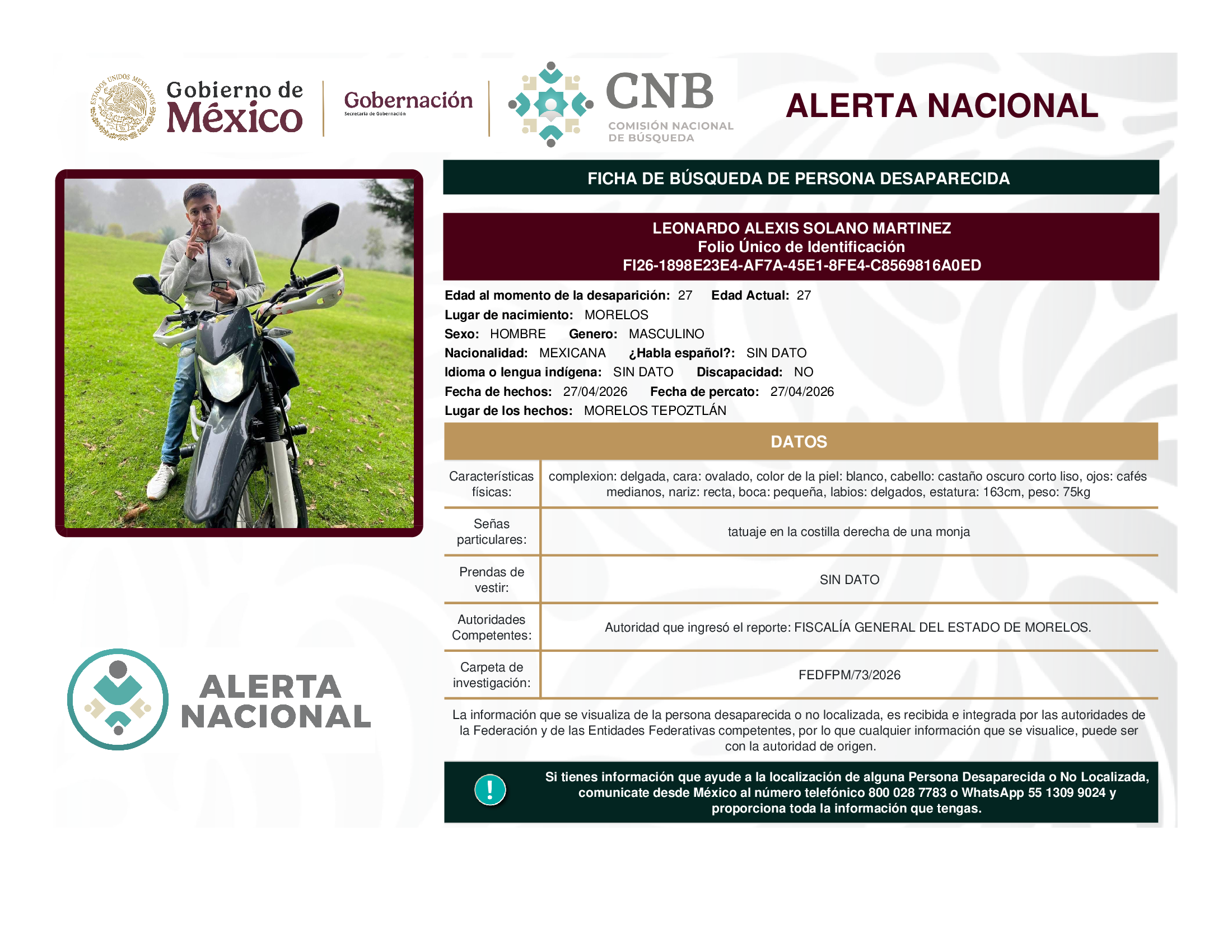A solicitud de la Comisión Nacional de búsqueda de personas y con fundamento en la Ley General en Materia de Desaparición Forzada de Personas, Desaparición Cometida por Particulares y del Sistema Nacional de Búsqueda de Personas, así como el Protocolo Nacional para la Activación de la Alerta Nacional de Búsqueda, Localización e Identificación de Personas Desaparecidas y No Localizadas, publicado en el Diario Oficial de la Federación el 18 de febrero de 2026, se hace de su conocimiento las siguientes Fichas de Búsqueda de Personas Desaparecidas y No Localizadas: