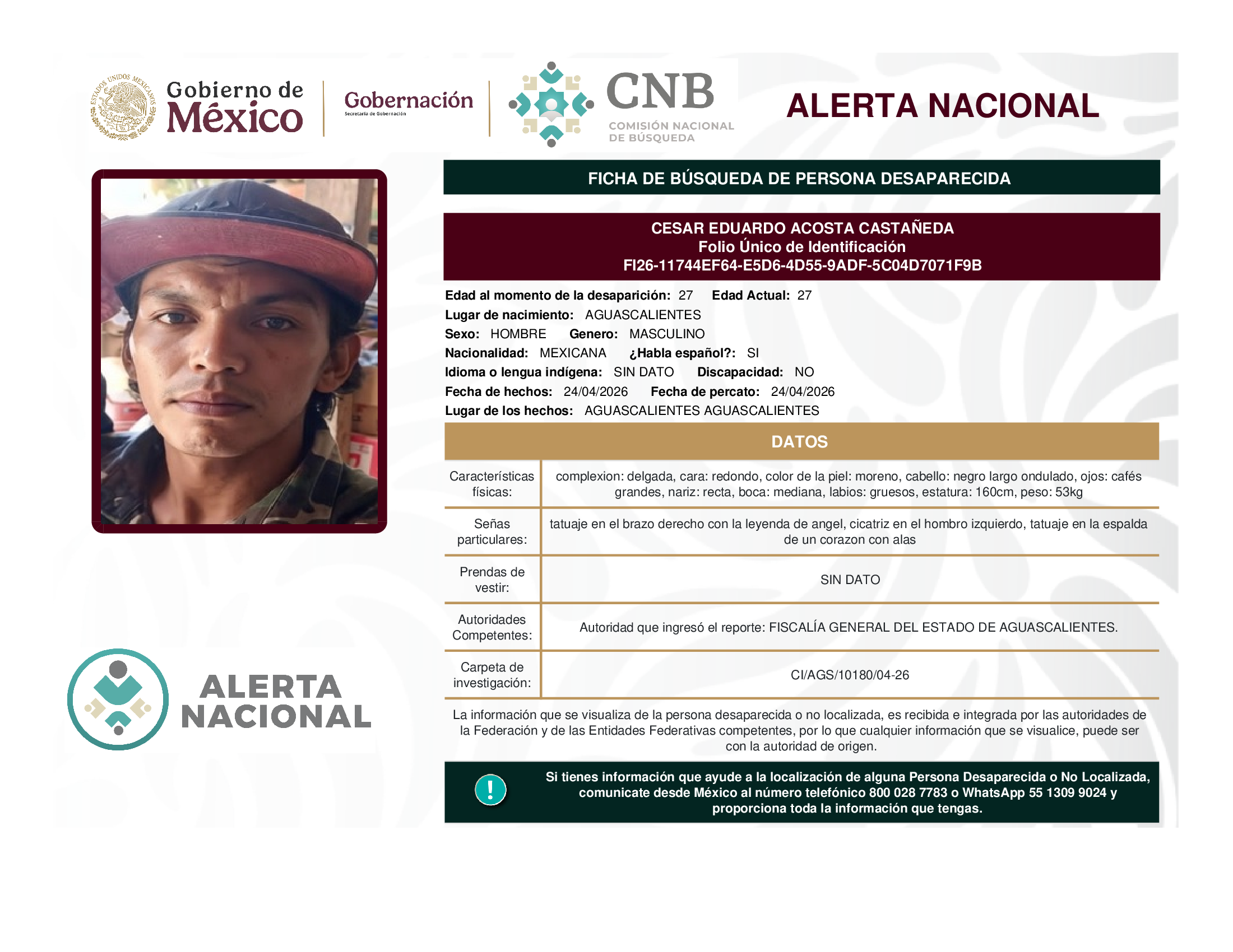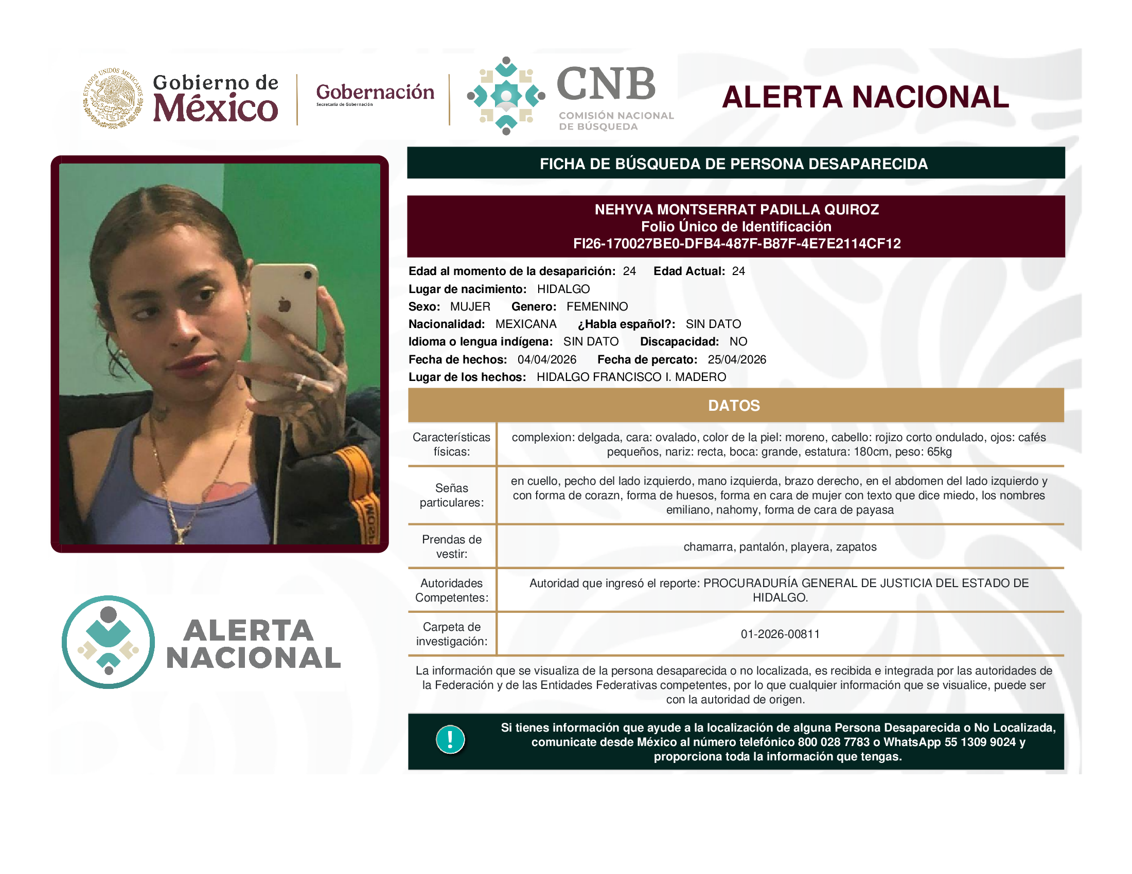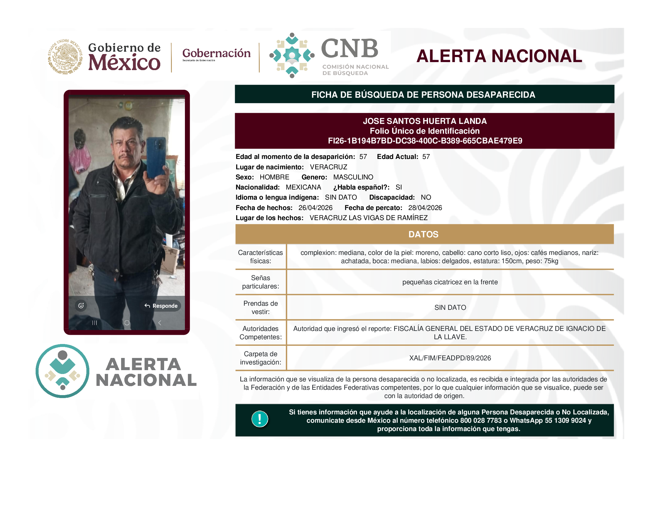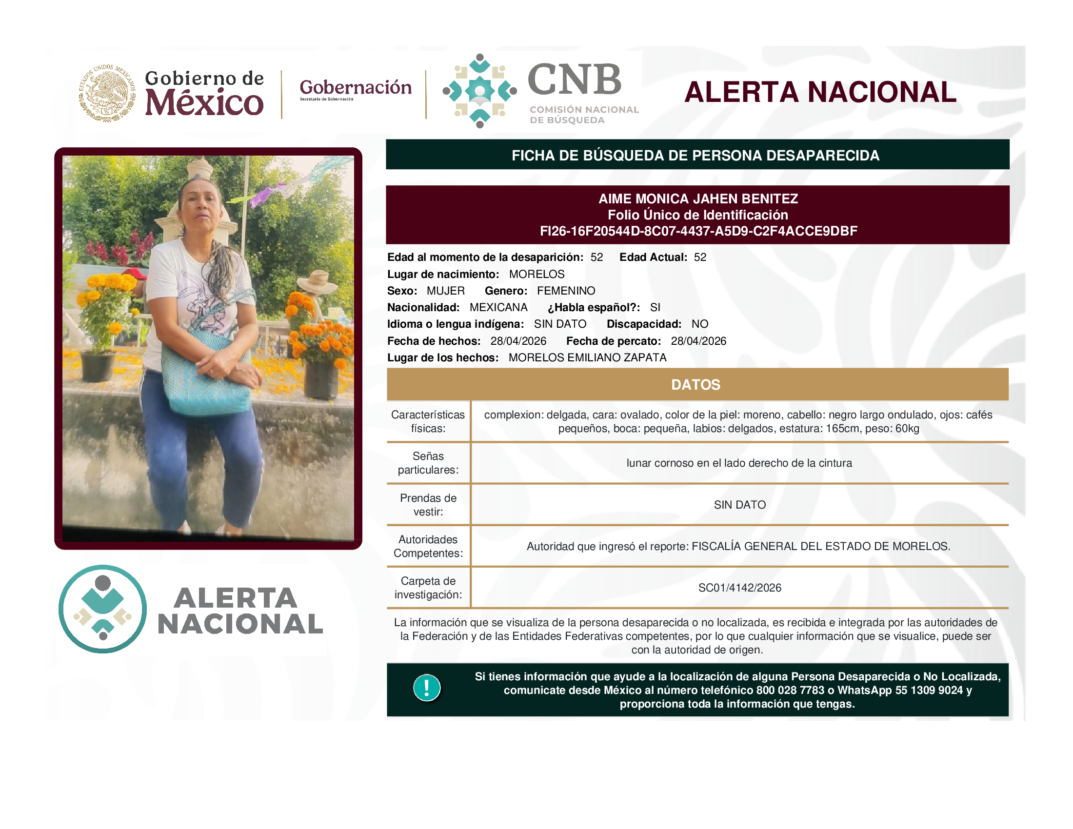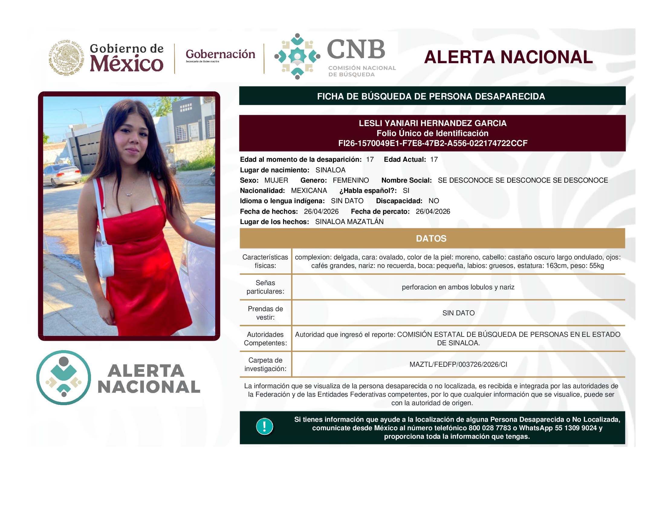 A solicitud de la Comisión Nacional de búsqueda de personas y con fundamento en la Ley General en Materia de Desaparición Forzada de Personas, Desaparición Cometida por Particulares y del Sistema Nacional de Búsqueda de Personas, así como el Protocolo Nacional para la Activación de la Alerta Nacional de Búsqueda, Localización e Identificación de Personas Desaparecidas y No Localizadas, publicado en el Diario Oficial de la Federación el 18 de febrero de 2026, se hace de su conocimiento las siguientes Fichas de Búsqueda de Personas Desaparecidas y No Localizadas: