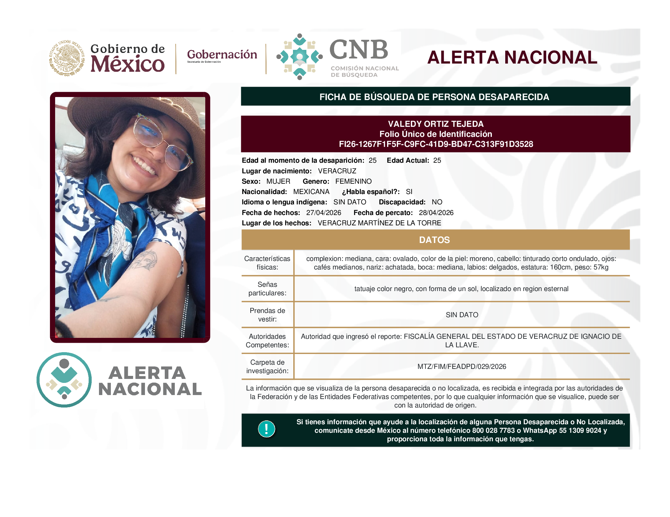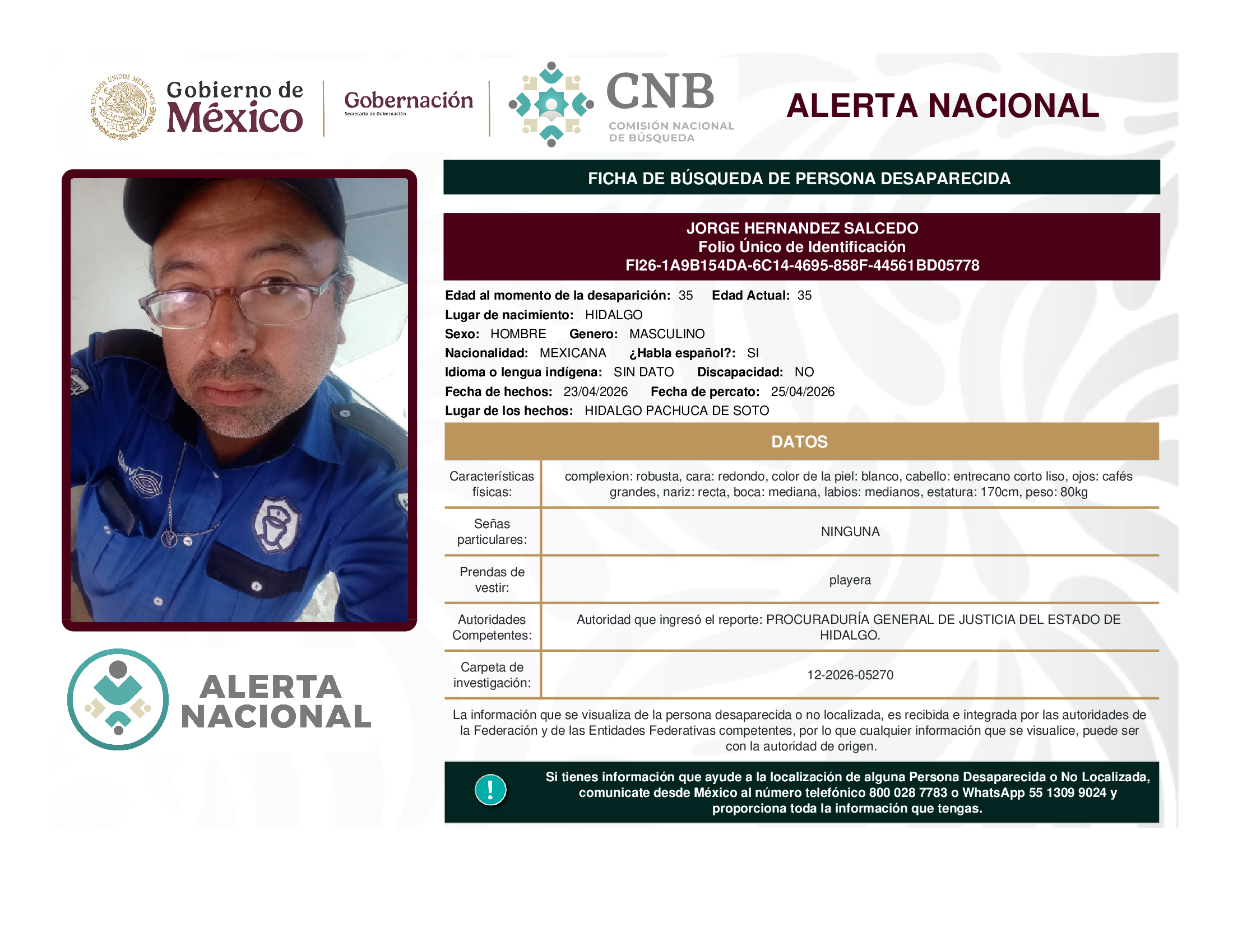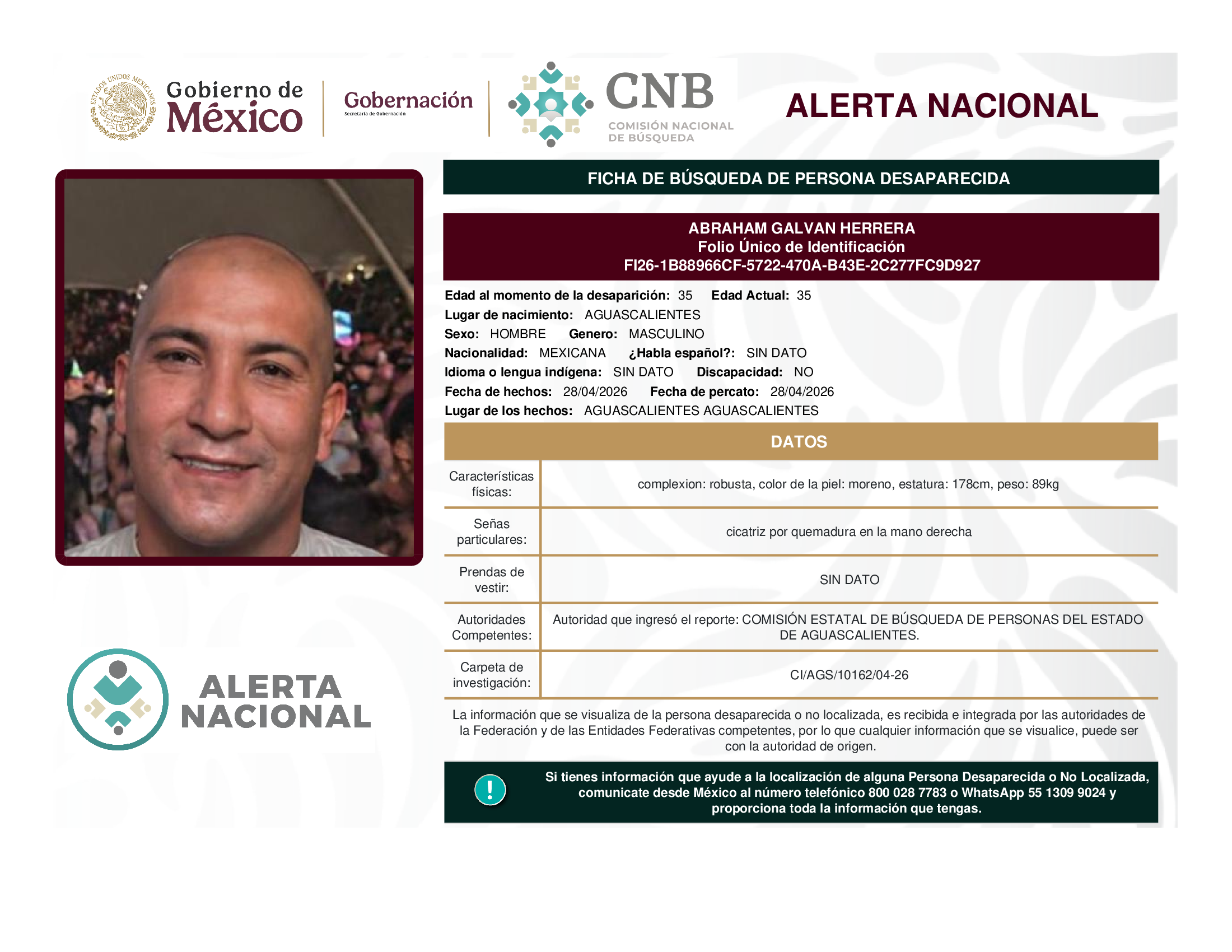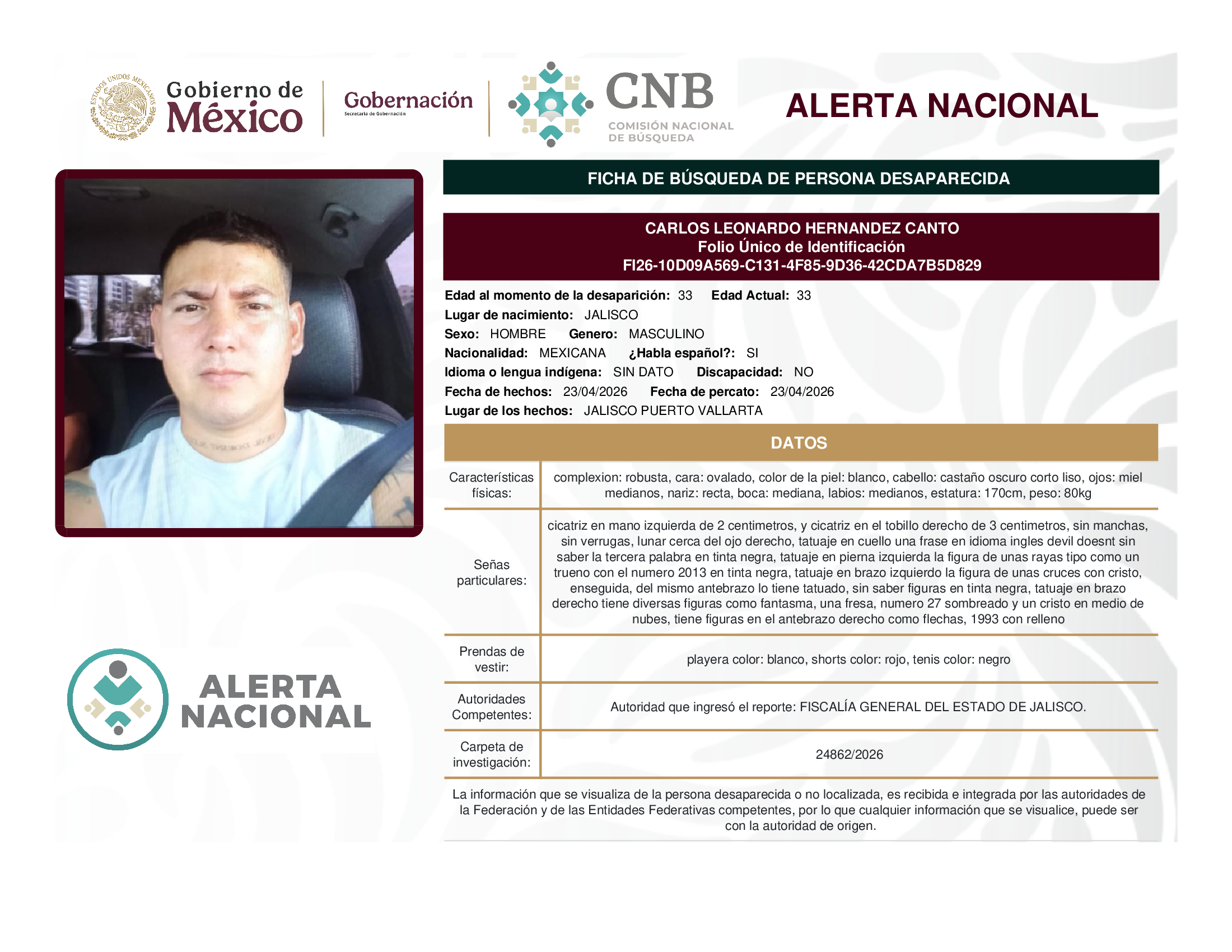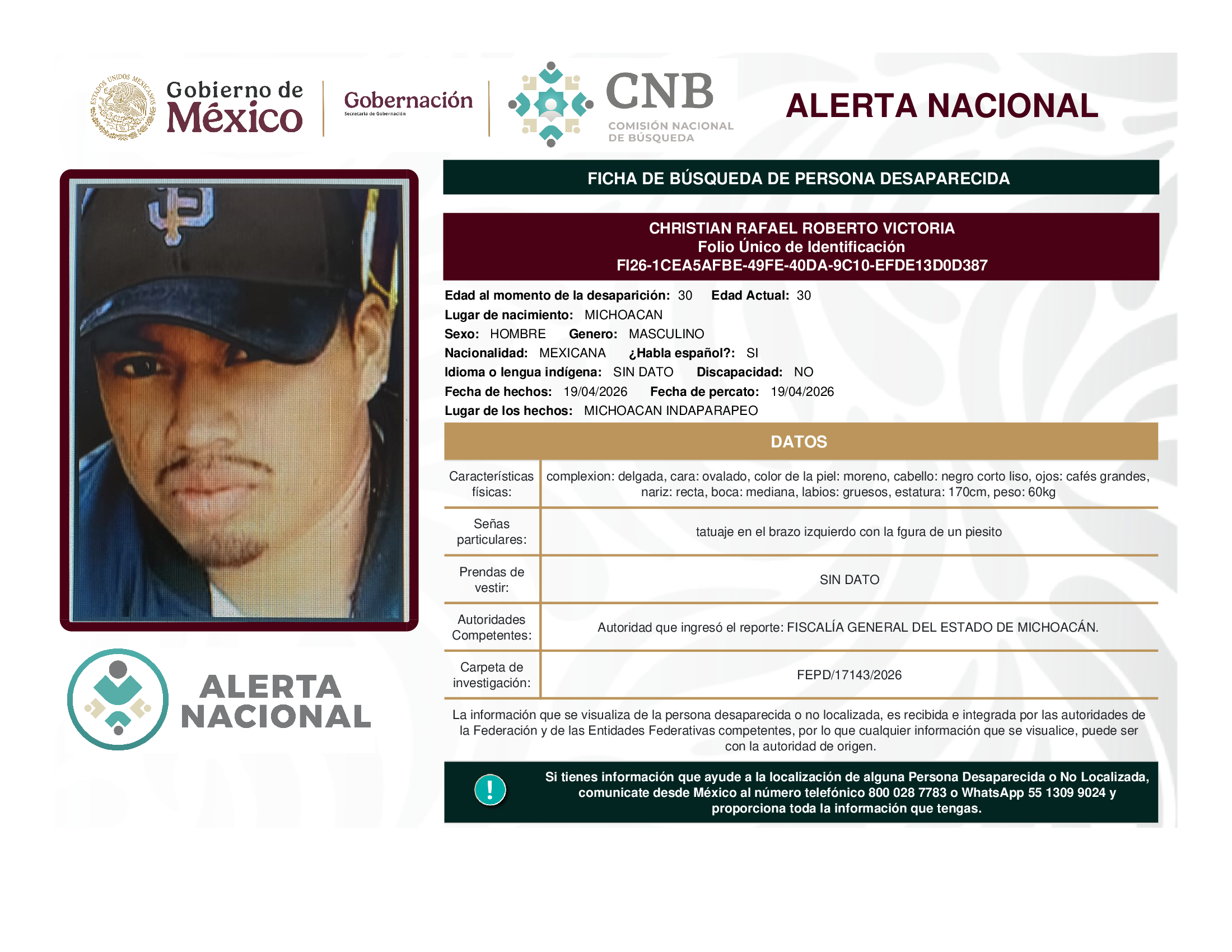 A solicitud de la Comisión Nacional de búsqueda de personas y con fundamento en la Ley General en Materia de Desaparición Forzada de Personas, Desaparición Cometida por Particulares y del Sistema Nacional de Búsqueda de Personas, así como el Protocolo Nacional para la Activación de la Alerta Nacional de Búsqueda, Localización e Identificación de Personas Desaparecidas y No Localizadas, publicado en el Diario Oficial de la Federación el 18 de febrero de 2026, se hace de su conocimiento las siguientes Fichas de Búsqueda de Personas Desaparecidas y No Localizadas: